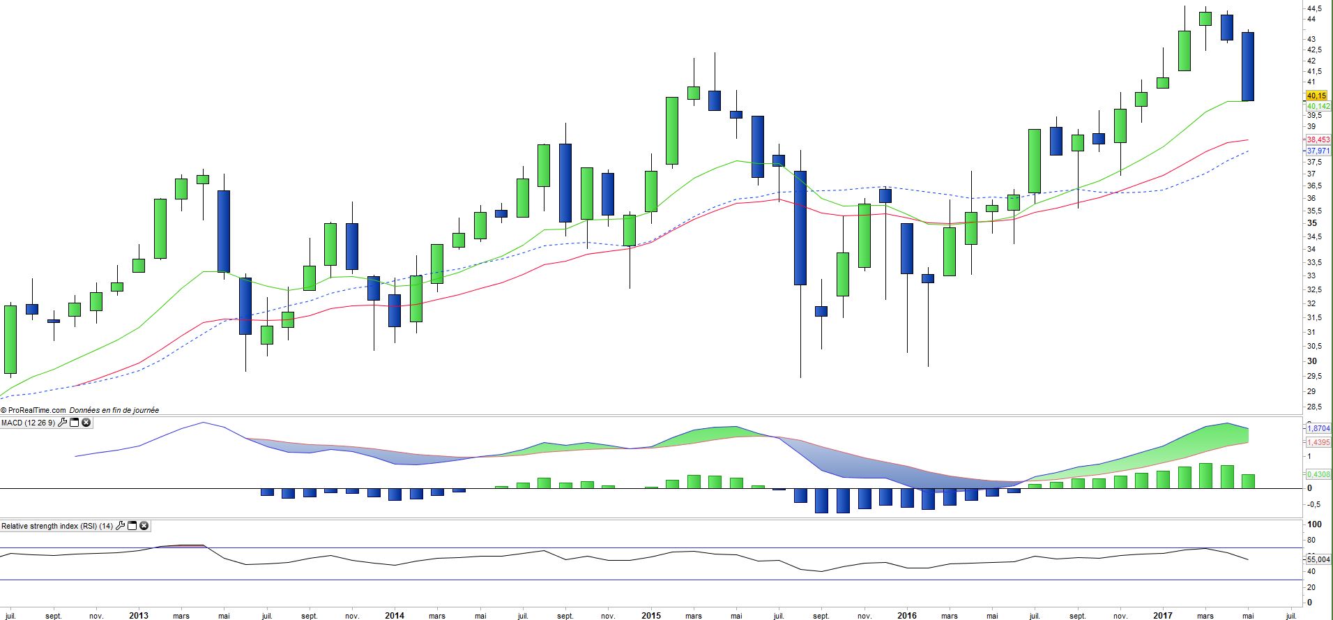 L’analyse des graphiques mensuels confirme la tendance haussière de long terme avec des sommets toujours nettement plus hauts que les précédents malgré des consolidations marquées. Nous nous attendions à une consolidation (annoncée dans notre fiche précédente), mais son ampleur est troublante (-6,6% au mois de mai) et la grande bougie noire est menaçante pour la suite. La correction n’est pas terminée et devrait aller tester le niveau des 38€ où se trouvent les M26 et M100. En dessous de ces niveaux la tendance haussière serait remise en cause.