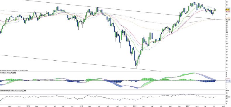 Le graphique mensuel montre une tendance long terme qui est redevenue haussière depuis le début de 2017, ce qui a été validé par un croisement des moyennes 13x26. Après un sommet réalisé en février, l’indice a corrigé fortement au printemps (-20%) mais a rebondi sur sa moyenne 13e et semble désormais prêt pour une 2ème vague de hausse.