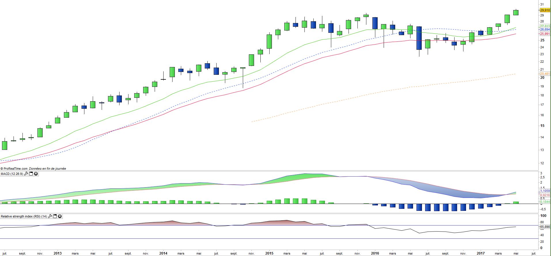 L’analyse des graphiques mensuels nous indique une reprise haussière en forte accélération depuis 2 mois, qui fait suite à un démarrage plus lent que le marché en début d’année, après une année 2016 difficile (Brexit, attentats…) et marquée par la consolidation. L’indice franchit de nouveaux sommets, après avoir dépassé ceux de 2015, tandis que le MACD mensuel vient de croiser à la hausse ce qui est prometteur pour la suite de la tendance.
