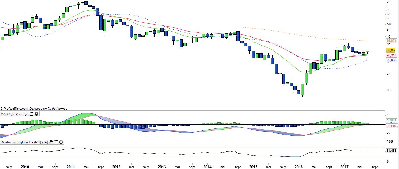 Les graphiques à long terme donnent également des signaux intéressants. Les moyennes 13x26 se sont croisées à la hausse tandis que le MACD est en train de passer la ligne de zéro, ce qui implique que la tendance à long terme est de nouveau positive, ce qui n’était pas le cas depuis le milieu de l’année 2011. Le prochain objectif est de retrouver (et dépasser) le sommet de début d’année autour des 35$.